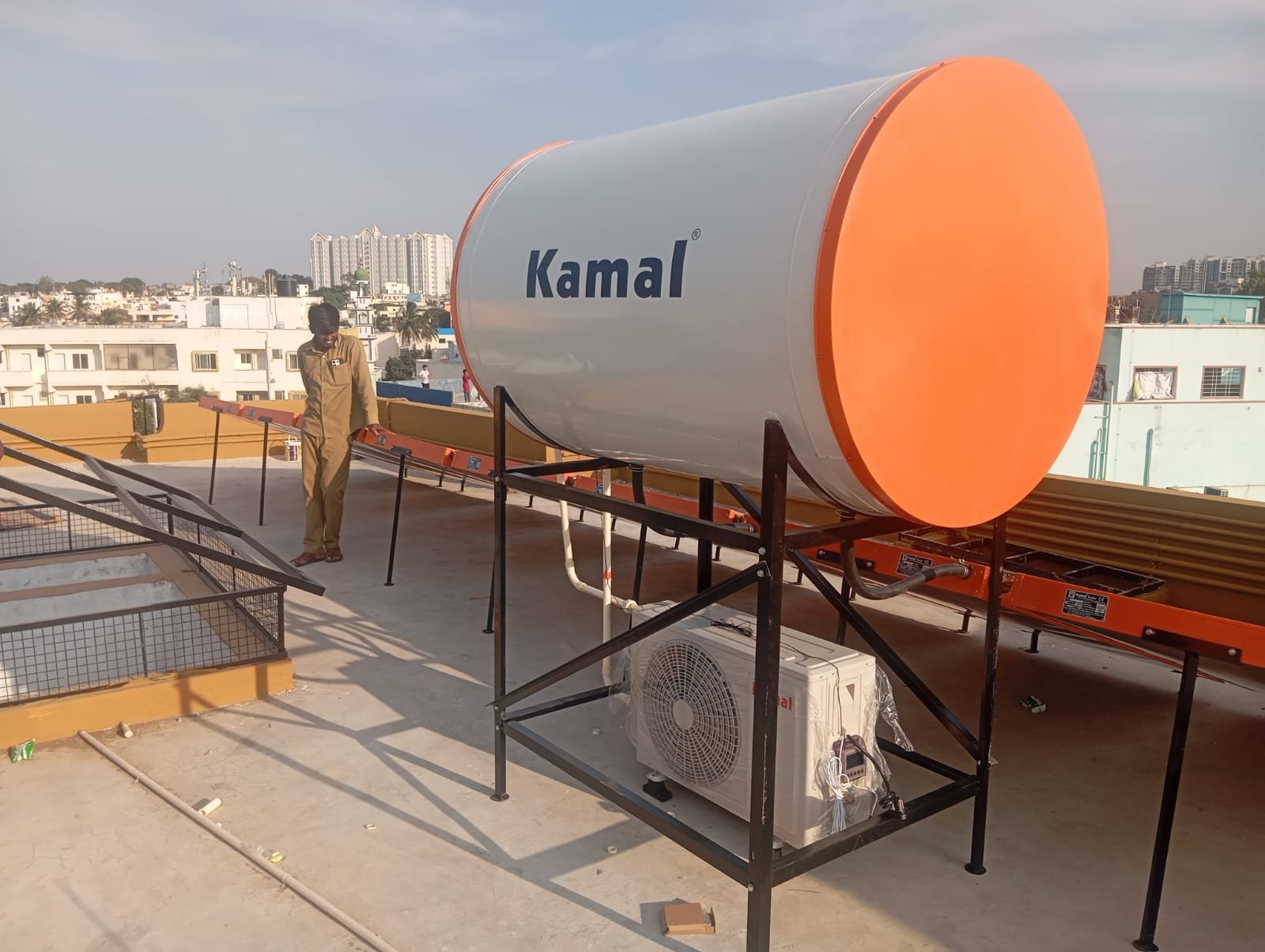 The Kamal 1000 LPD Solar Water Heater with Heat Pump is a high-capacity, energy-efficient hybrid heating solution designed for commercial establishments and large residential applications. Built with a durable MS epoxy coated storage tank, this system ensures long-lasting performance, corrosion resistance, and consistent hot water supply.